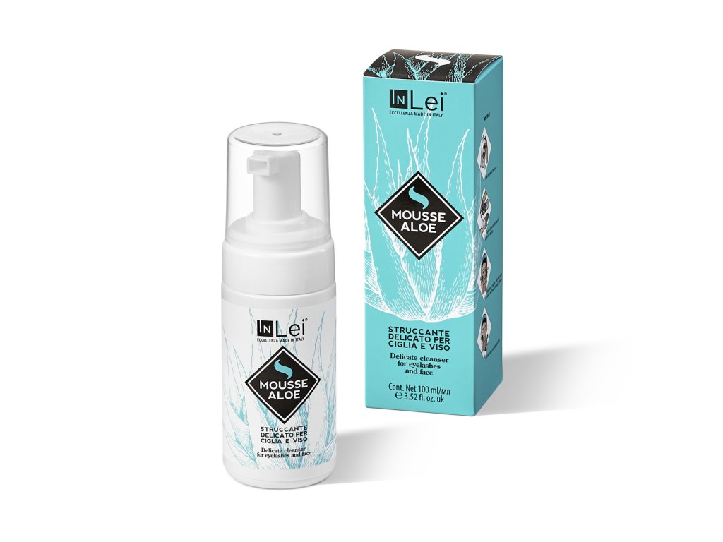 InLei® „MOUSSE ALOE“ inovativní produkt pro péči a čištění přírodních řas a prodlužovaných řas. Tato měkká a obklopující pěna, speciálně vytvořená pro tu nejjemnější pokožku, jemně čistí a odstraňuje make-up z celého obličeje, odstraňuje nečistoty a přebytečný maz z oblasti řas.